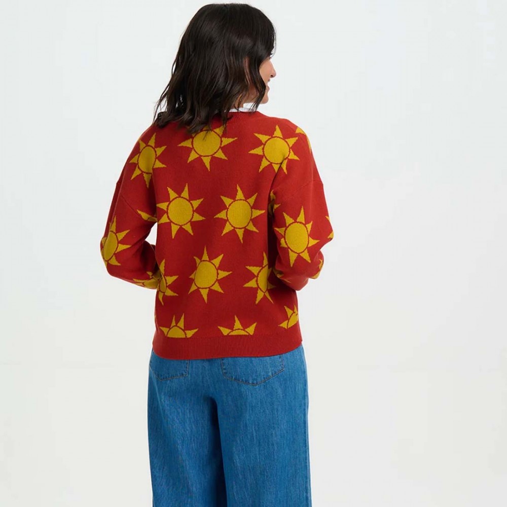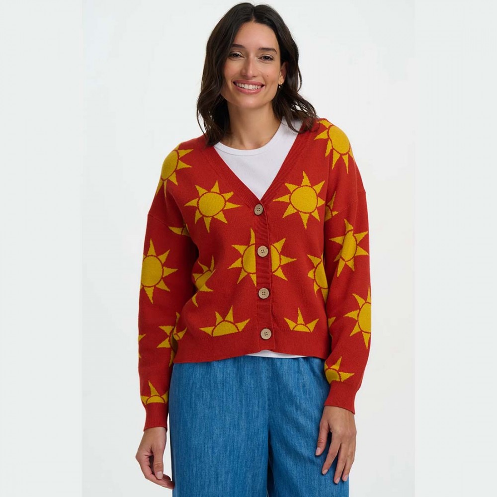 Цей кардиган Angelica від Sugarhill Brighton легко поєднується з іншими повсякденними речами і підходить для креативного нашарування. Зроблений з дихаючого котону, він прикрашений сонячним візерунком у ретро-стилі на поличці та спинці, жовтим на червоно-іржавому тлі. У нього вільний оверсайз фасон, класичний V-виріз, застібка на гудзиках.