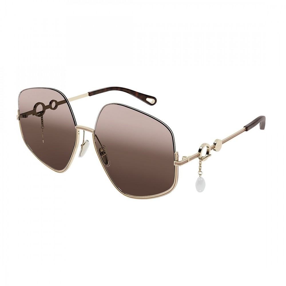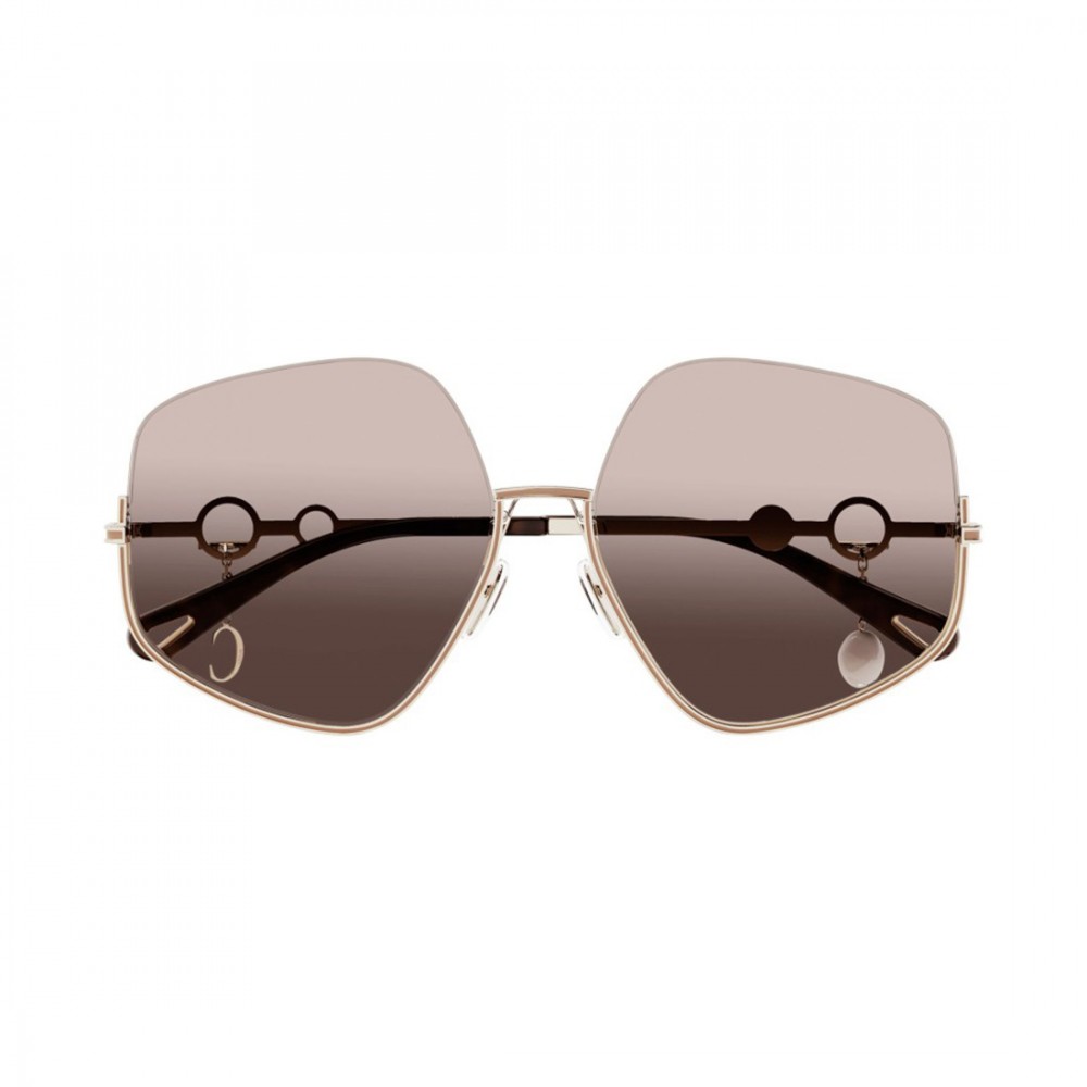 Ці жіночі п'ятикутні сонцезахисні окуляри Sofya вносять грайливу нотку в вінтажну естетику 70-х завдяки знімній підвісці, елегантній перлині Swarovski. Коричневі лінзи з градієнтом загорнуті в золотисту металеву оправу. У завушниках є круглі отвори для підвіски, яку за бажання можна замінити ювелірною прикрасою Chloé.