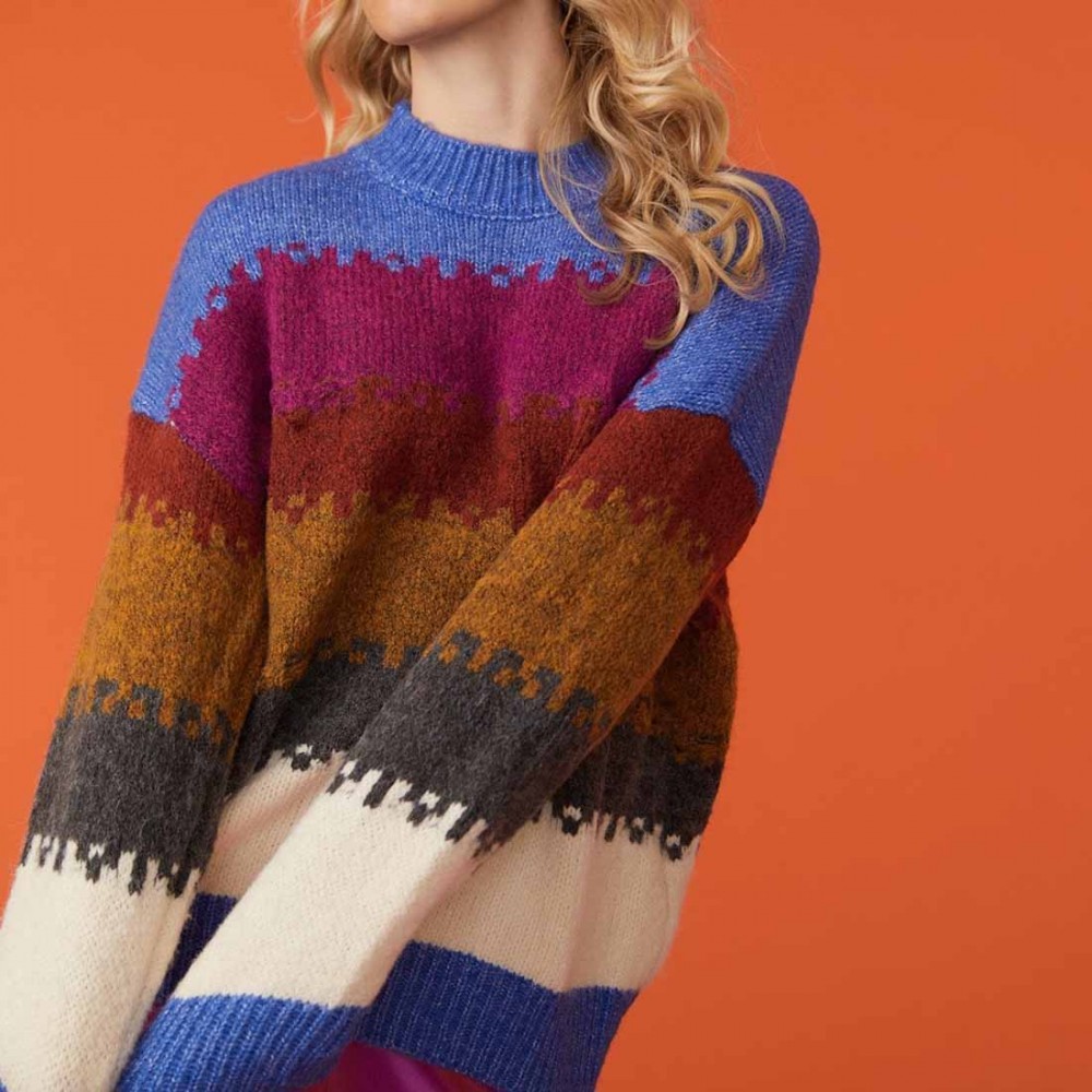 Джемпер у широкі горизонтальні смуги неповторюваних кольорів, від коричневого через кораловий та бежевий до фіолету та бірюзи, зроблено з екологічної суміші на базі бананової шкурки та кашеміру. Рифлені манжети та поділ. Склад: 30% кашеміру, 20% бананового волокна, 50% віскози/району. Єдиний універсальний розмір S/L.